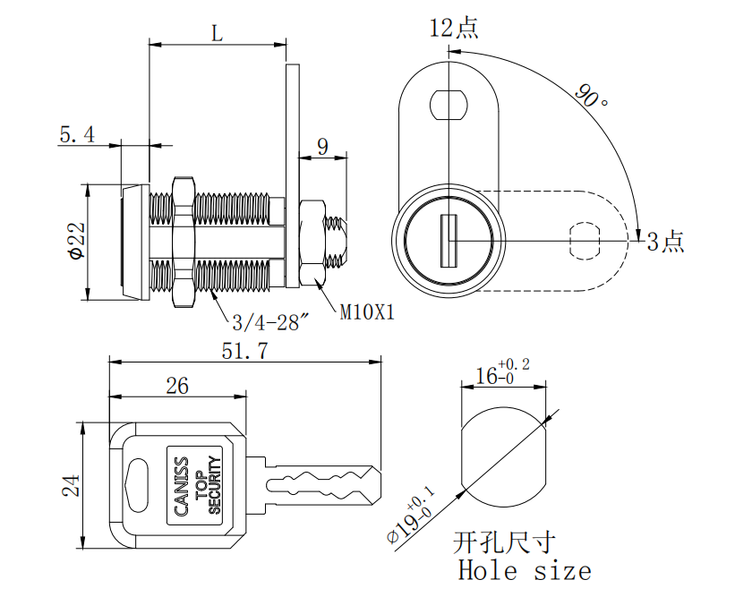 1.90°旋轉(zhuǎn)實(shí)現(xiàn)開(kāi)啟或關(guān)閉。鑰匙在12點(diǎn)位置拔出。