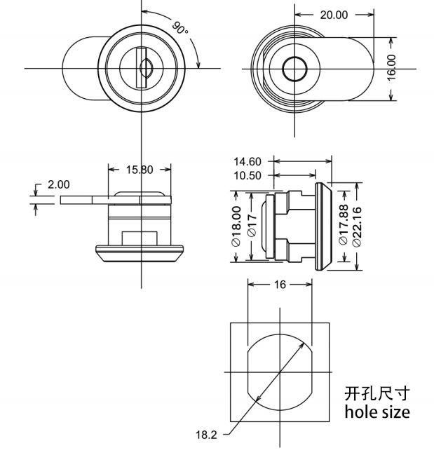 1.90°旋轉(zhuǎn)實現(xiàn)開啟或關(guān)閉。不留匙。尾片鉚接。尾片可選可訂制。