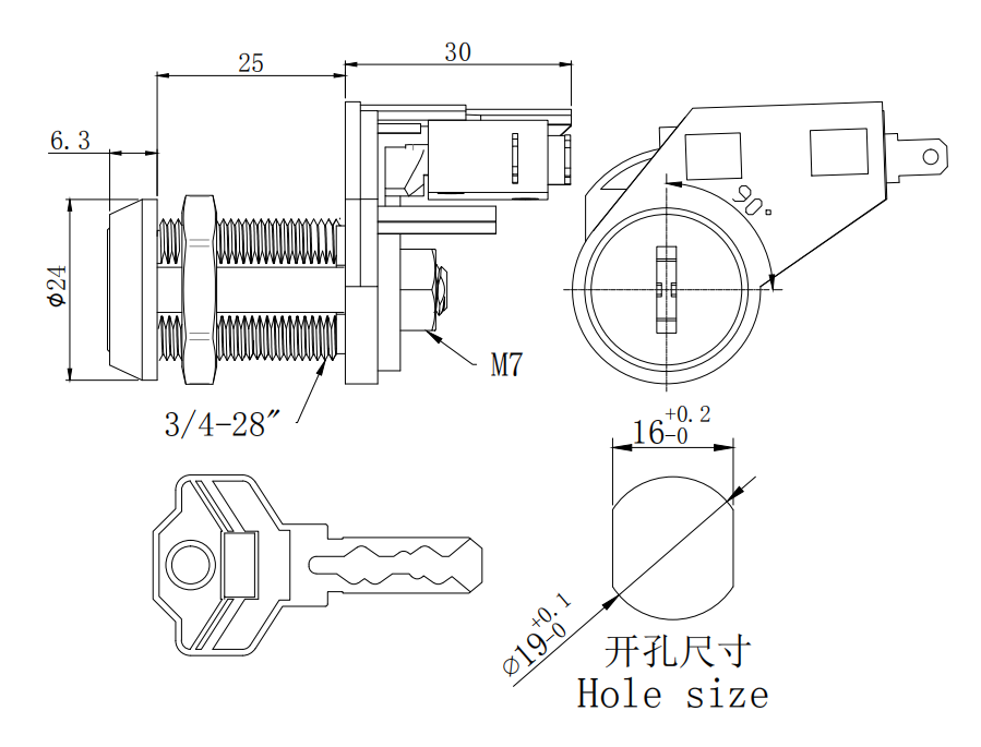 1.90°旋轉實現開啟或關閉。鑰匙在12點位置拔出。