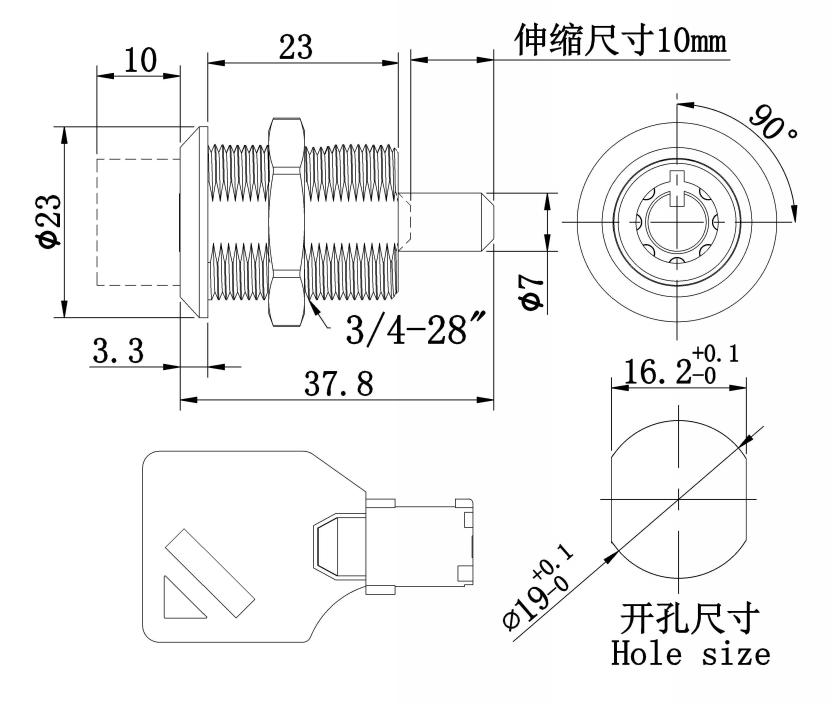 °旋轉實現開啟,鑰匙在12點位置拔出,按