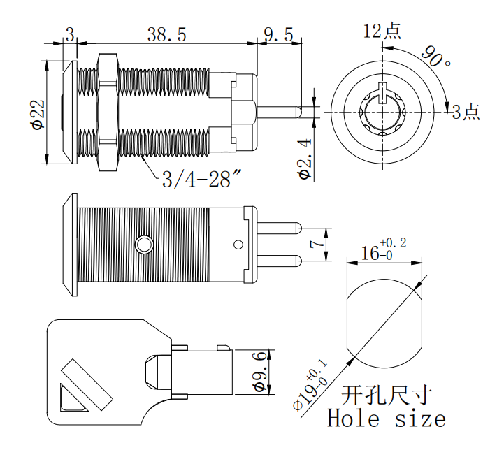 1.90°旋轉(zhuǎn)實(shí)現(xiàn)開(kāi)啟或關(guān)閉,鑰匙在12點(diǎn)位置拔出。